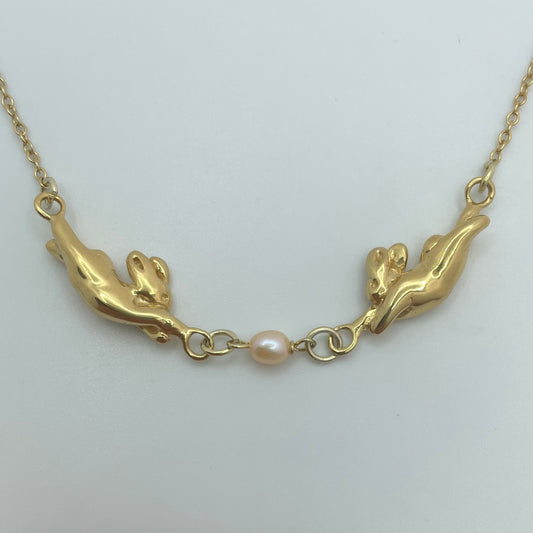Dancing Bunny Necklace with Rounded Pearl - Gold